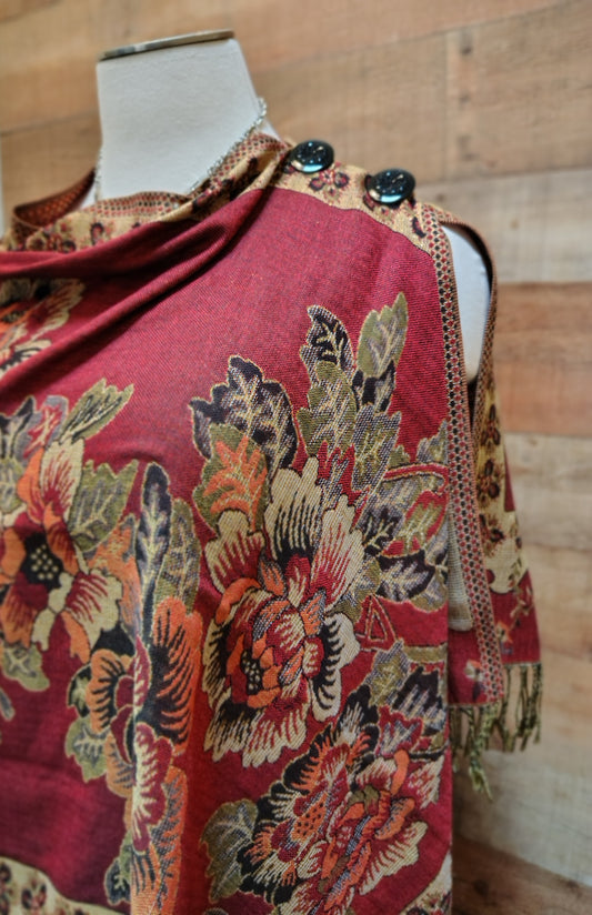 2 Button Original Design Shawl-Dark Burgundy Metallic Floral