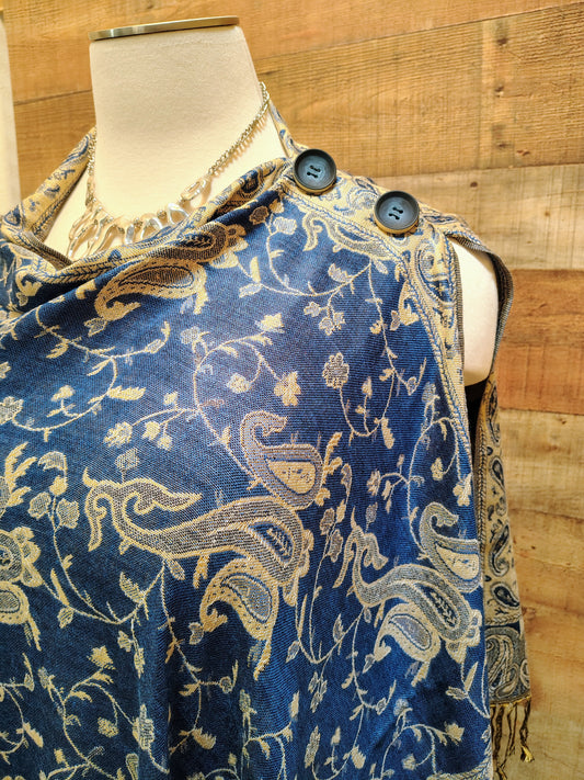 2Button Original Design Shawl Royal Blue & Beige Paisley